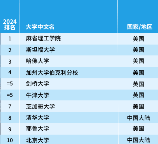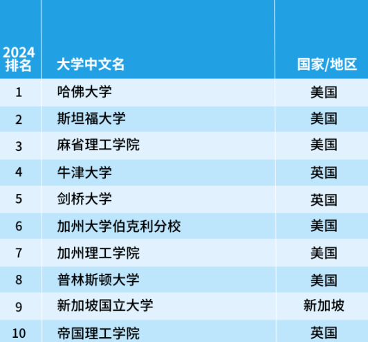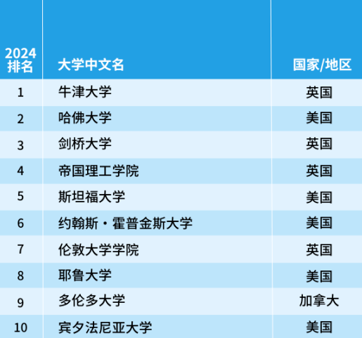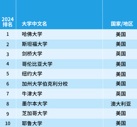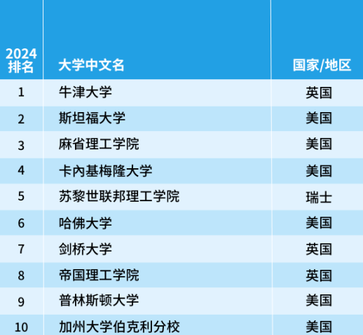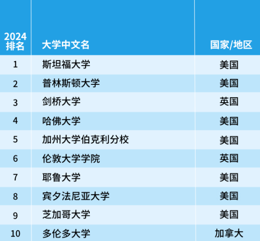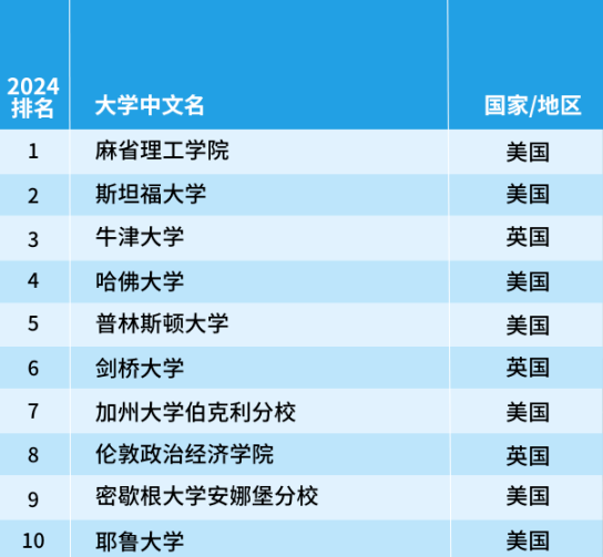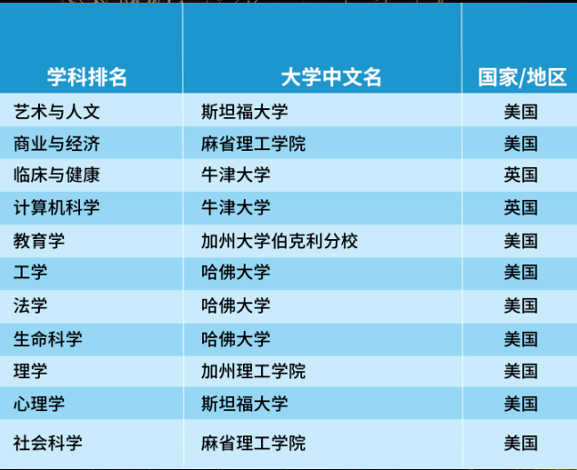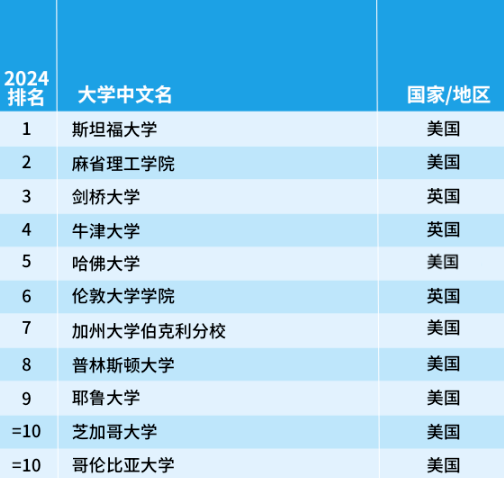 排在首位的依舊是美國(guó)斯坦福大學(xué),耶魯大學(xué)和哥倫比亞大學(xué)今年躋身前十,而愛(ài)丁堡大學(xué)則跌出前十名,排名降至第12位。