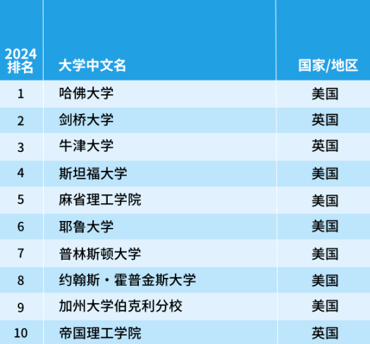 哈佛大學(xué)連續(xù)第四年排名第一。英國(guó)高校中,牛津大學(xué)和劍橋大學(xué)和分別上升了1名和2名,位于第5名和第7名。帝國(guó)理工大學(xué)此次進(jìn)入前十,位于第10名的位置。