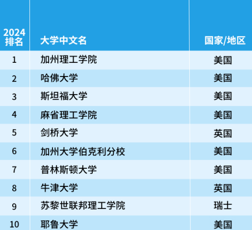 美國(guó)的加州理工學(xué)院上升3名位于榜首,英國(guó)的劍橋大學(xué)上升兩名位于第五位,瑞士蘇黎世聯(lián)邦理工學(xué)院連續(xù)第八年保持前十名的位置,再次排名第9。