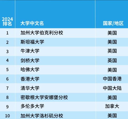 加州大學(xué)伯克利分校首次超越斯坦福大學(xué)奪得榜首,英國(guó)的牛津大學(xué)上升2名進(jìn)入榜單前三,劍橋大學(xué)依舊位于第4名。